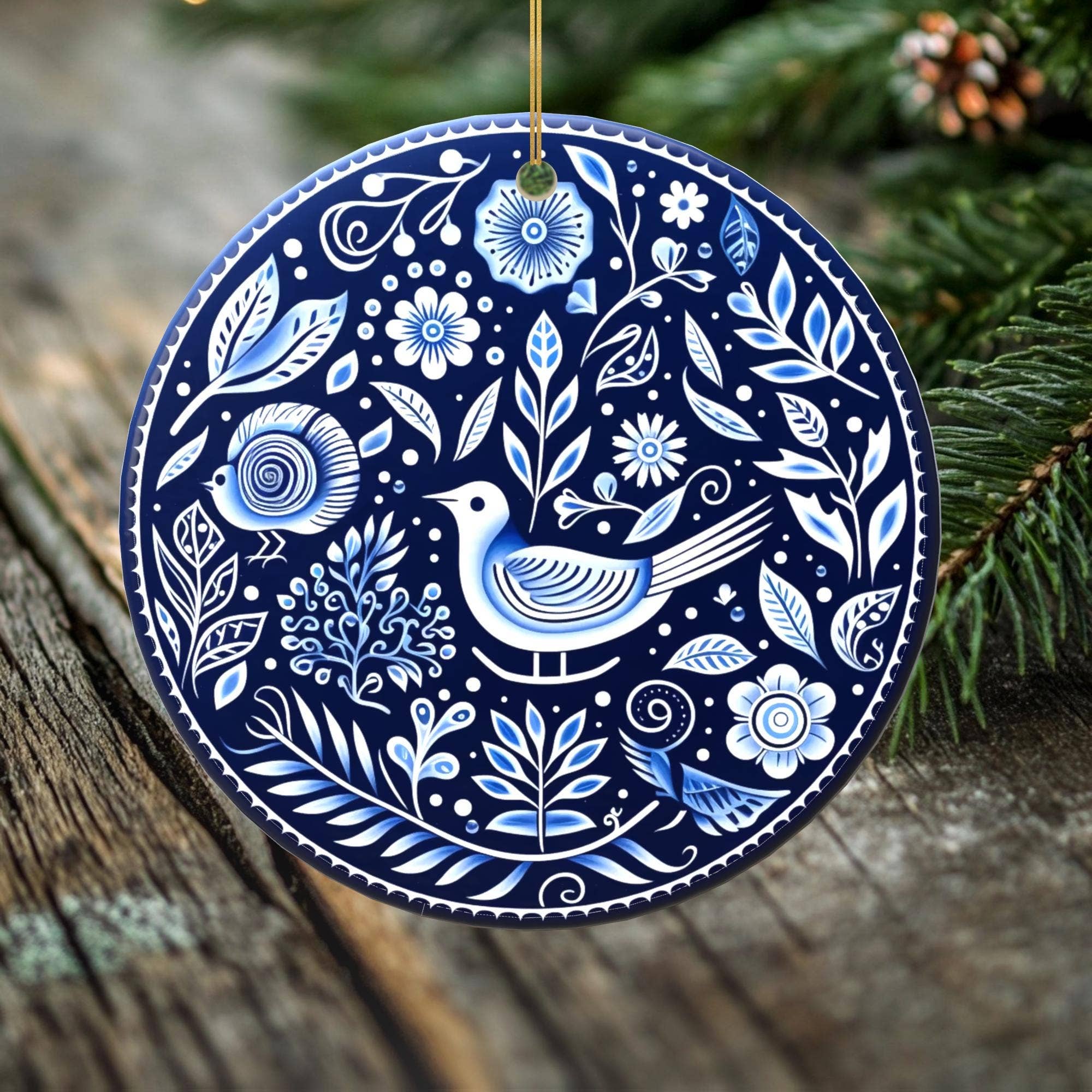 Celebrate the season with this beautiful folk art-inspired bird porcelain ornament, featuring intricate floral patterns and a timeless blue and white palette. Crafted with care using high-quality materials and techniques, each ornament is finished with layered gloss and matte for a captivating heirloom-quality look. The double-sided design and nearly 3-inch diameter make this piece a standout on any Christmas tree or holiday display. Perfect as a gift or for adding a touch of artistry to your seasonal decor, this ornament brings the charm of folk art to your home.