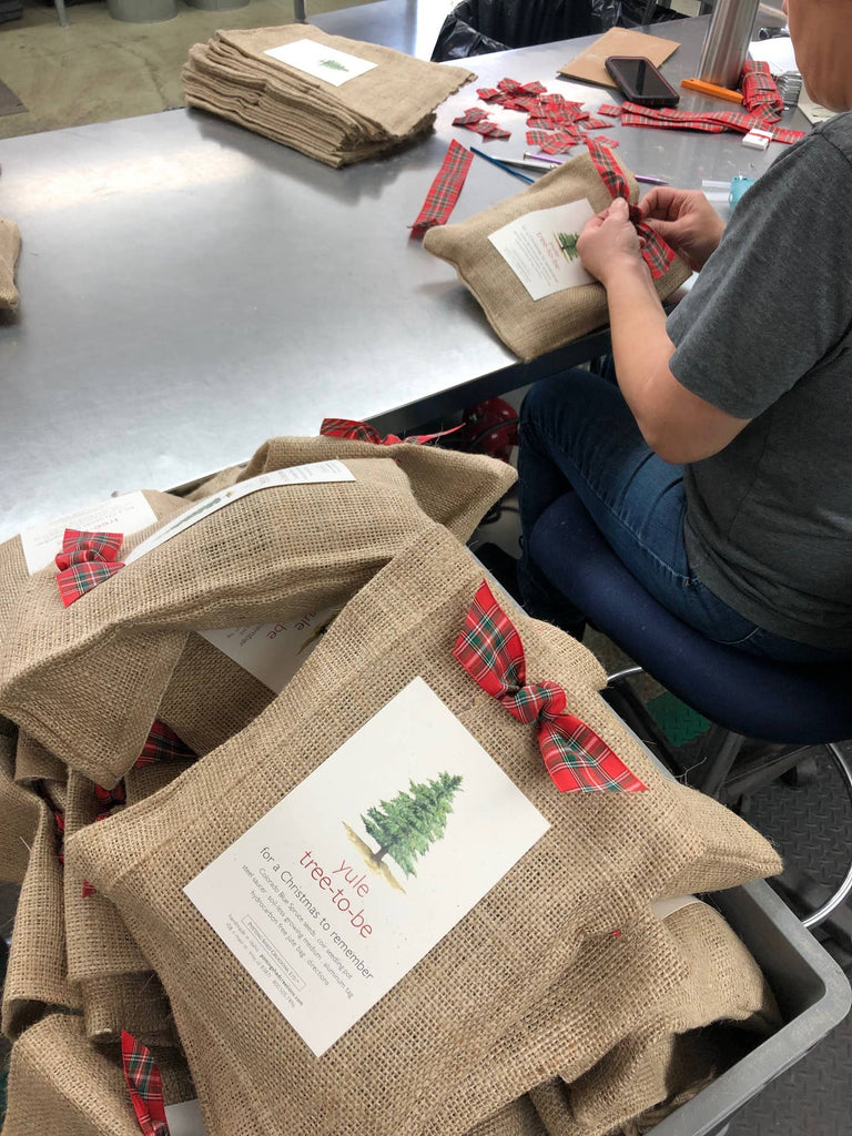 Great gift idea to commemorate a special event or anniversary. Includes: hand-tied grosgrain ribbon, tree seed, coir seedling pot, OMRI listed soil, metal saucer, aluminum tag, jute bag, directions. Handmade in Idaho.