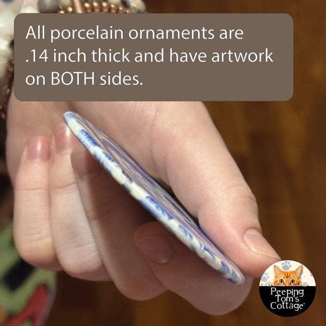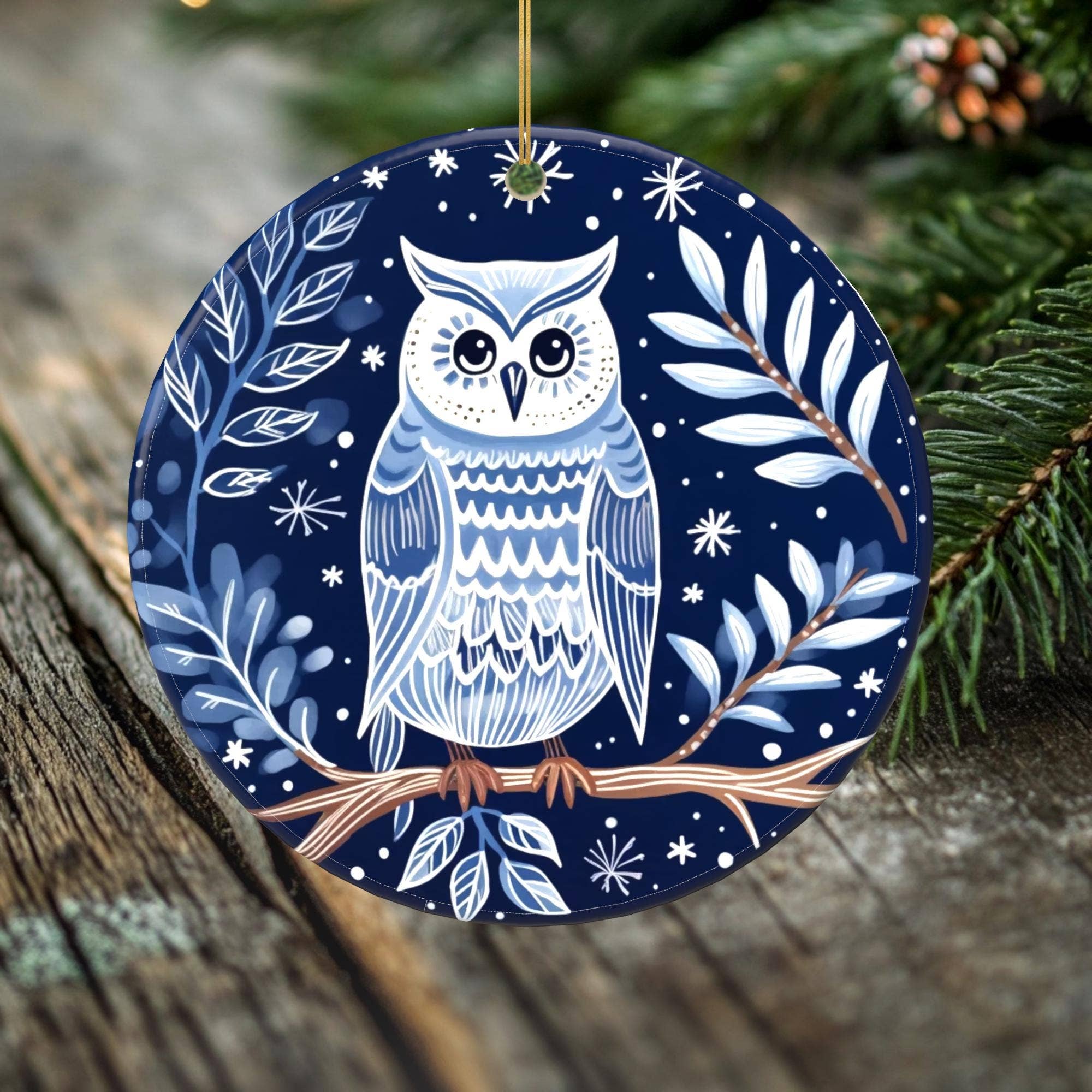 This charming porcelain ornament features a delightful snowy owl perched on a branch amidst a winter night sky. Handcrafted with high-quality ink and layered with gloss and matte finishes, it offers a remarkable sense of depth and an heirloom-like quality. Measuring nearly 3 inches in diameter, this double-sided ornament is perfect for adding a touch of elegance to your tree or gifting to loved ones. Bring the beauty of nature indoors this holiday season with this enchanting snowy owl ornament. Size: --Round, almost 3 inch diamater--2.94 inches across --.14 inches thick