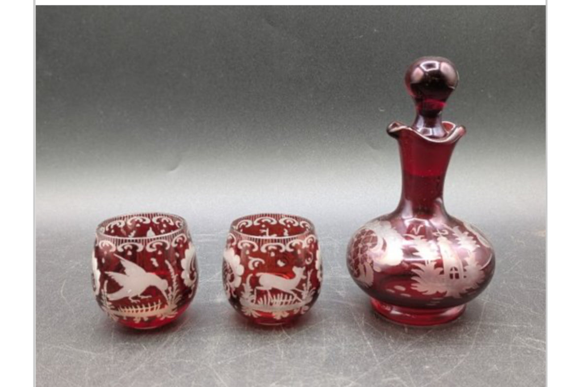 Antique Bohemian Egermann Ruby Red Cut To Clear Glass -Three Piece Mini Decanter and Shot Glasses Set is backordered and will ship as soon as it is back in stock.