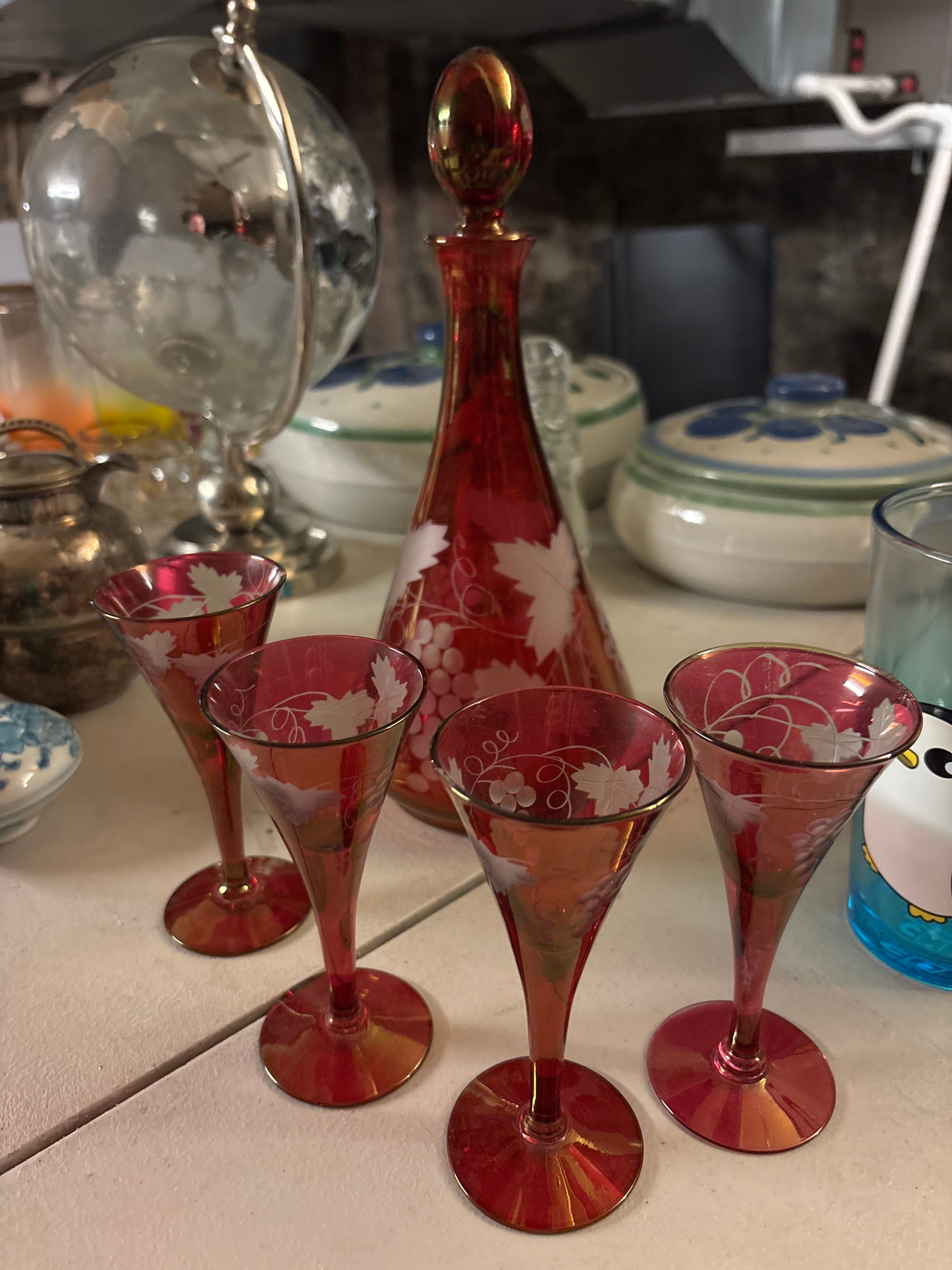 MCM Cranberry Etched Glass Decanter with Four Cordial Glasses is backordered and will ship as soon as it is back in stock.