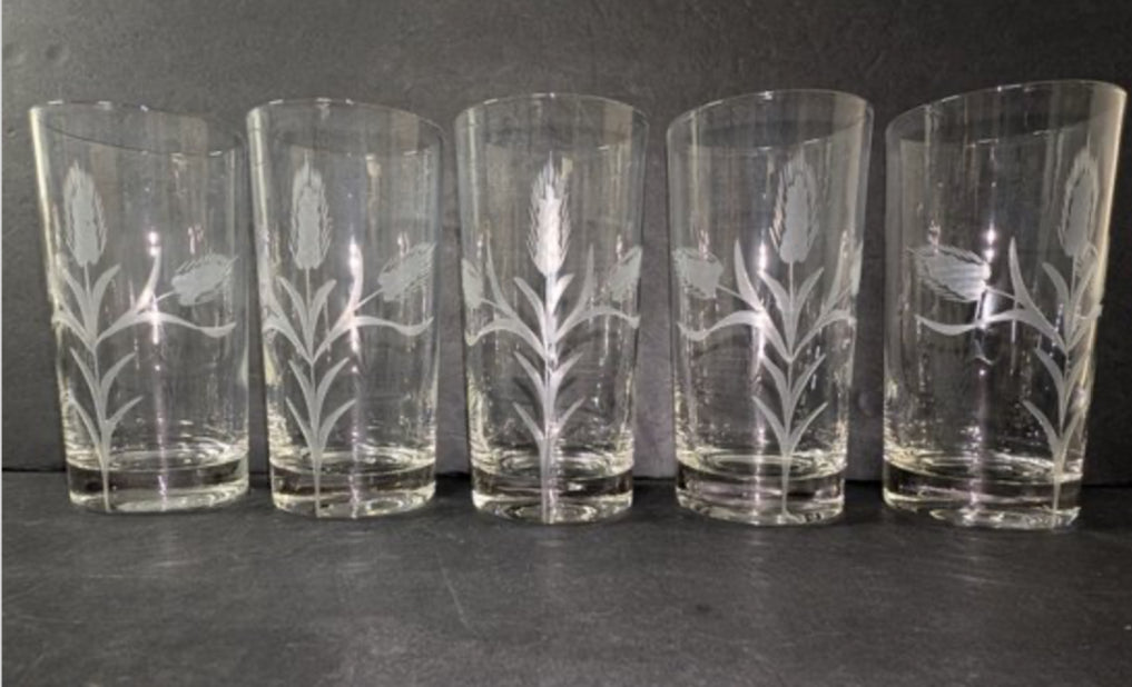 Vintage Etched Wheat Design Highball Glasses -set of 5 is backordered and will ship as soon as it is back in stock.