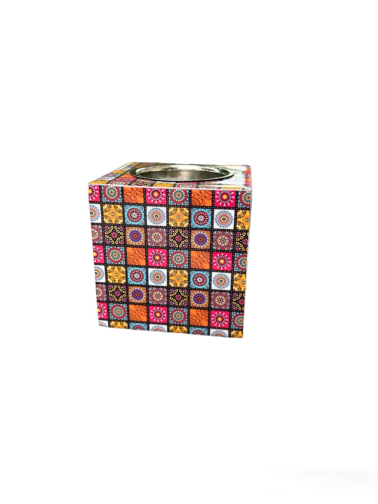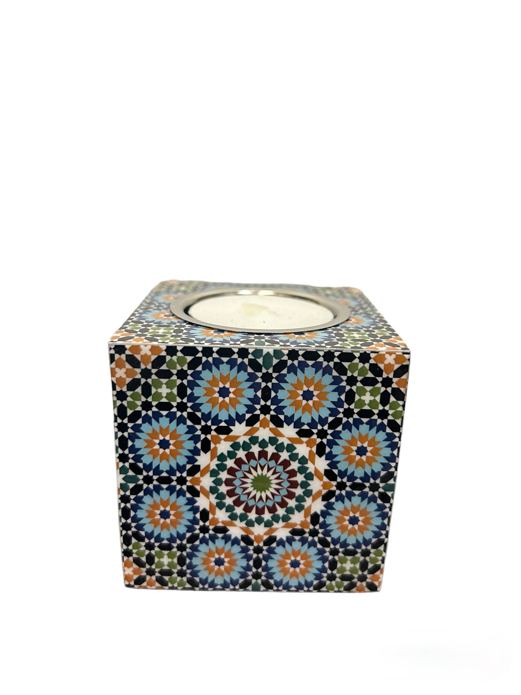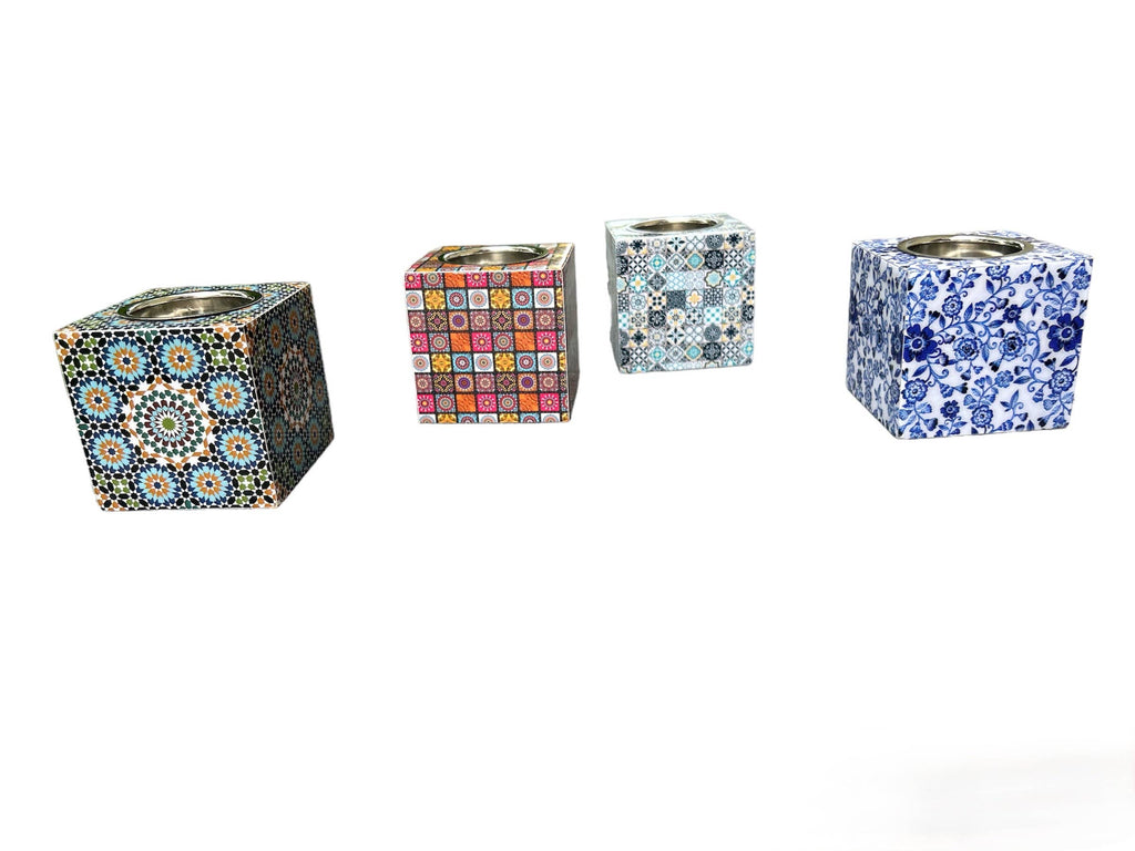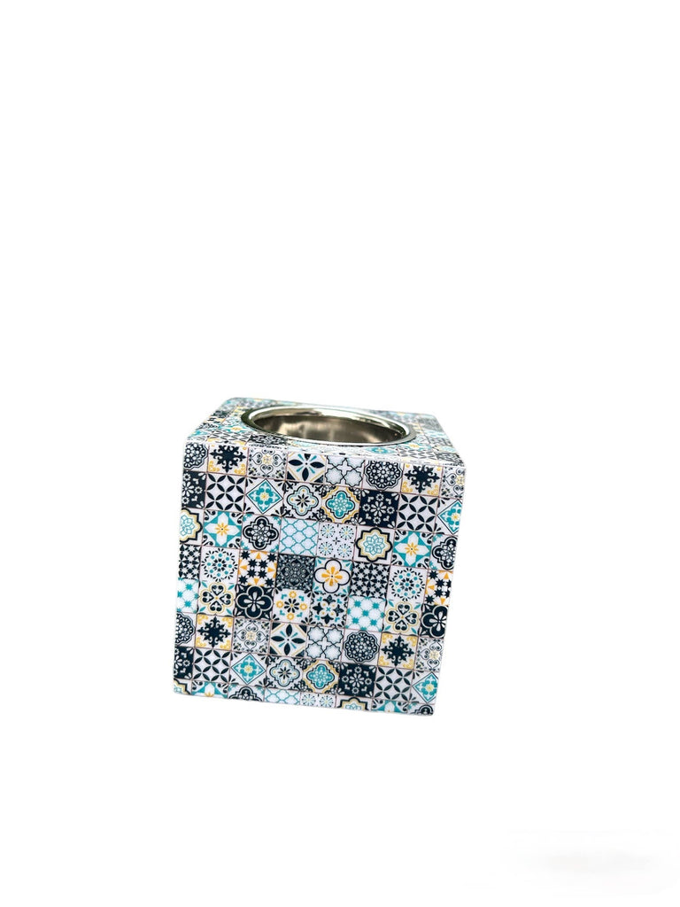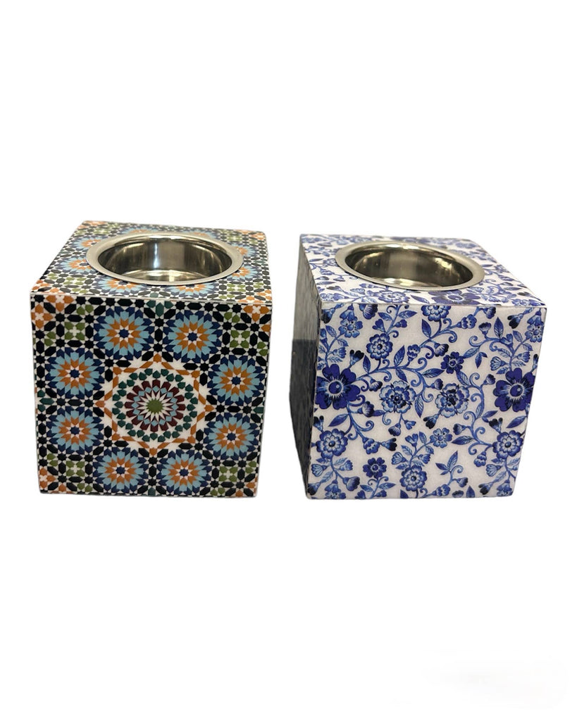 This lightweight decorative candleholder can brighten up any space. Ethically made in India. Wt 4oz Size 2.5β square Material: MDF and resin. Candle not included. Variations: White and Blue Blue Multi Green Handmade in India.